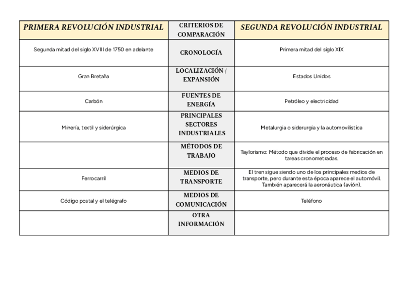 Tabla comparatoria de la 1ª y la 2ª revolución industrial