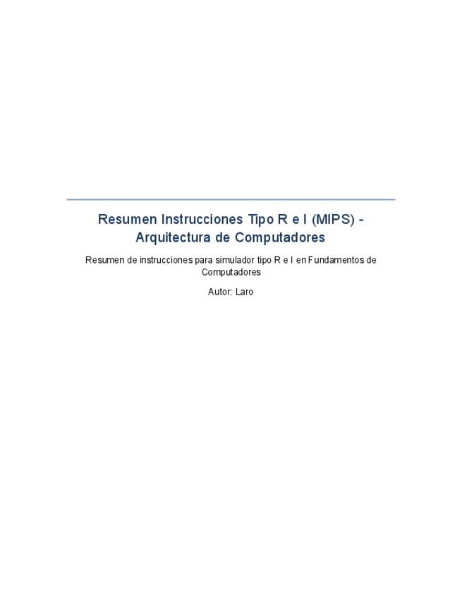 Hoja de referencia rápida sobre el repertorio de instrucciones para simulador (MIPS). Incluye la sintaxis y funcionamiento de instrucciones tipo R (add, sub, and, or, slt, jr) y tipo I (addi, andi, lw, sw, beq, bne), además de la pseudoinstrucción la. Ide