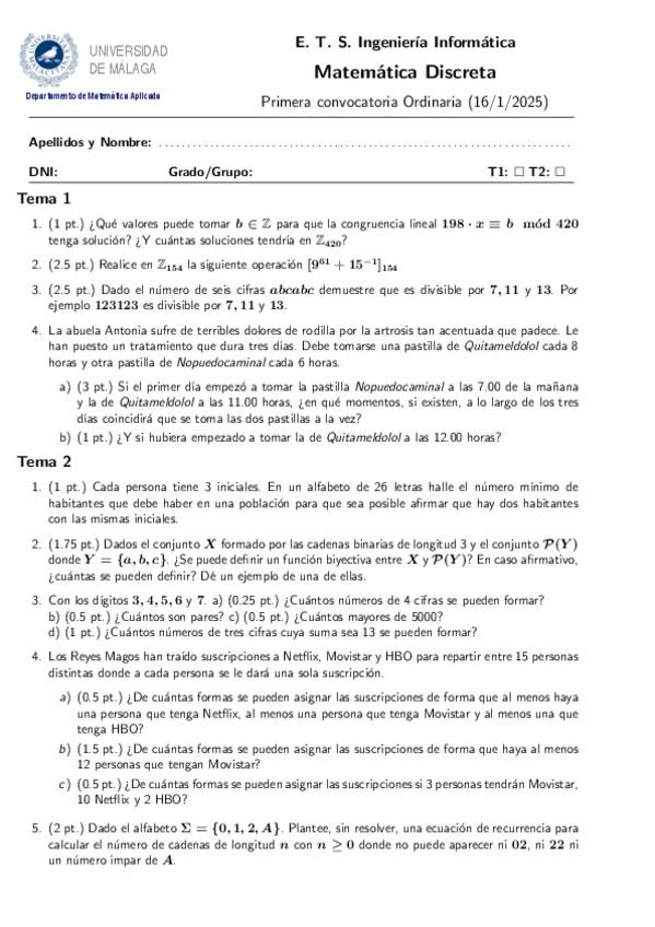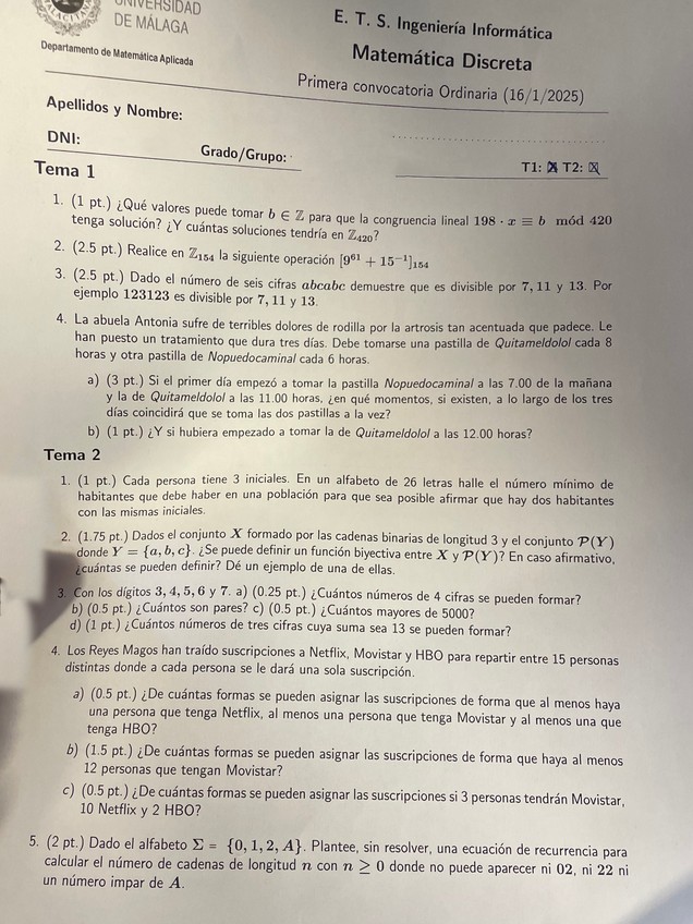 He publicado nuevos examenes de 1º Matemática Discreta: Examen-Bloque-2-Temas-3-4-Enero-2025.pdf