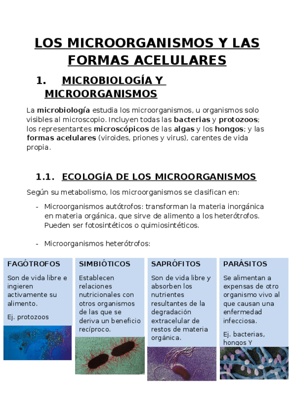 Apuntes de biología de 1º de Bachillerato sobre los microorganismos. Imágenes y fotografías incluidas.