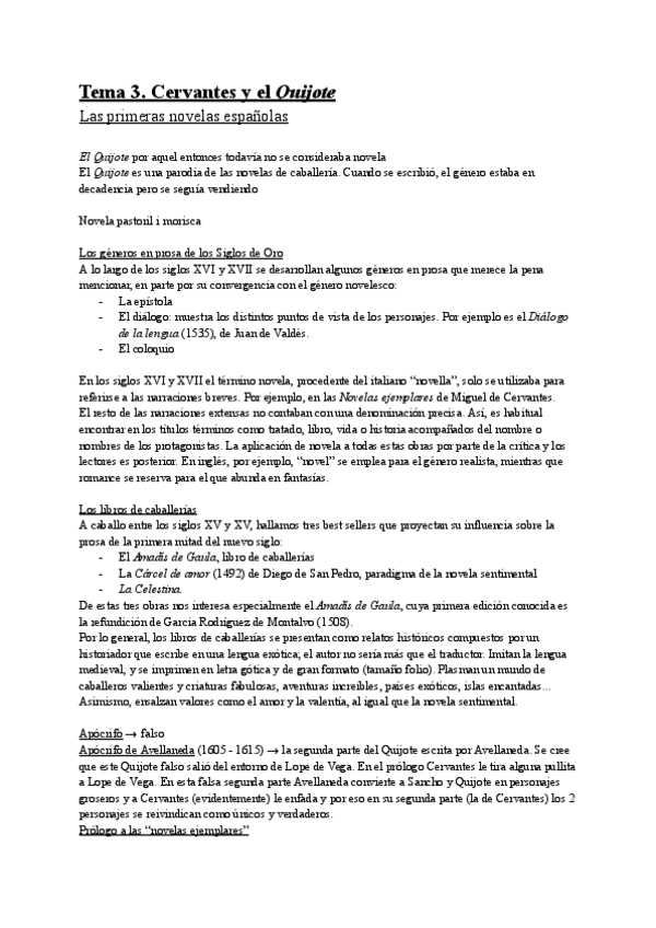 Apuntes literatura española - Tema 3. Cervantes y el Quijote (las primeras novelas españolas)