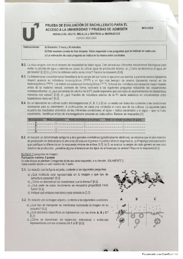 Examen selectividad biología de Andalucía curso 22/23