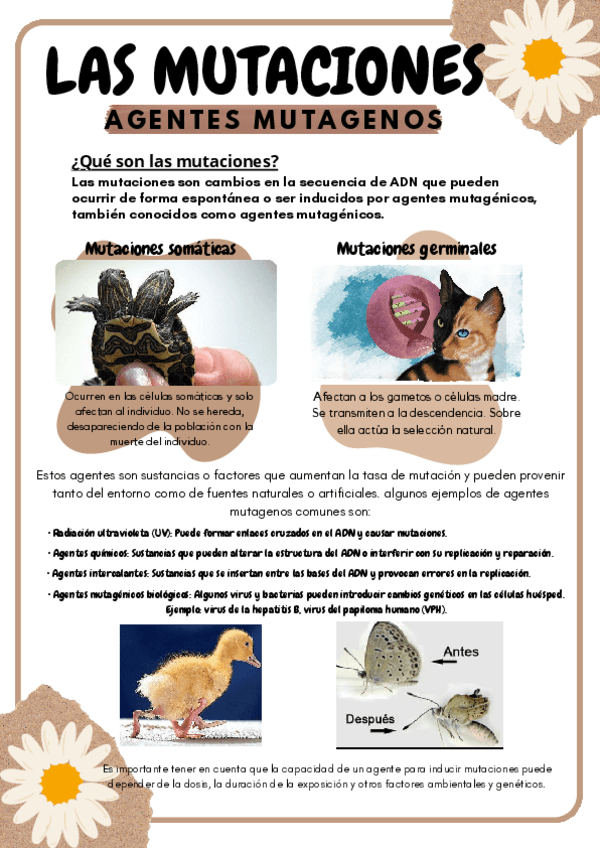 afiche sobre: las mutaciones, agentes mutágenos, mutaciones somáticas, mutaciones germinales