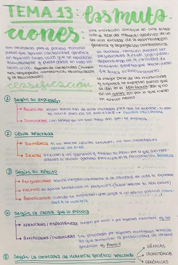 Resumen hecha a mano del tema 13 de biología para la PAU Selectividad 2025. Incluye explicaciones profundizadas y comprensibles, aclaraciones del tema basado en información extraída de clase de una alumna de 10. Tema 13 completo mutaciones genómicas, géni
