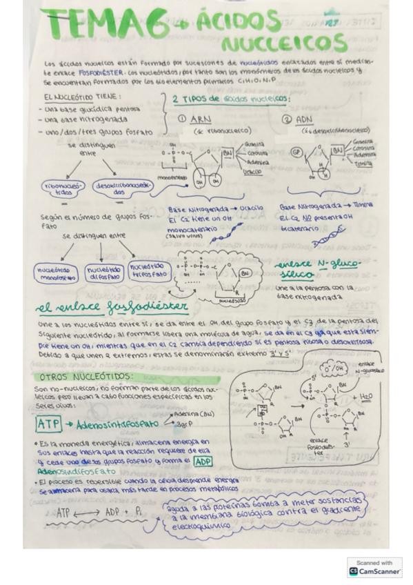 Apuntes/ resumen de clase de segundo de bachillerato orientado a la PAU del tema 6 de biología dentro del apartado de biomoléculas los ácidos nucleicos. Ejemplificaciones y datos de interés que no se incluyen en libros pero entra en el temario de clase y