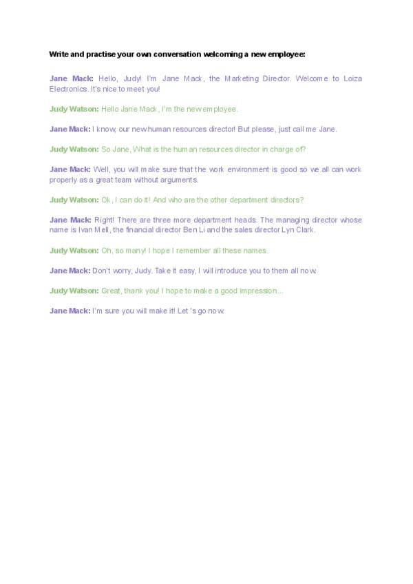Ejercicio conversación dándole la bienvenida a una nueva empleada en inglés.