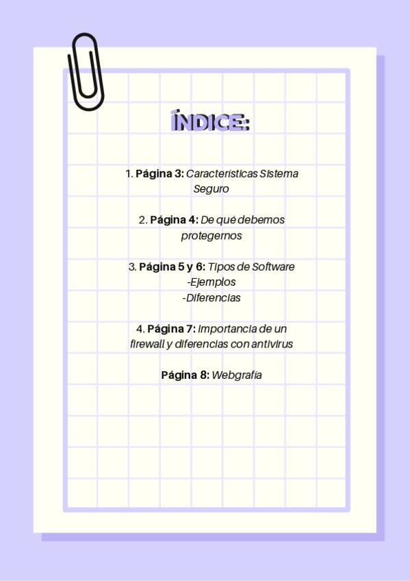 Página 3: Características Sistema Seguro Página 4: De qué debemos protegernos Página 5 y 6: Tipos de Software -Ejemplos -Diferencias Página 7: Importancia de un firewall y diferencias con antivirus Página 8: Webgrafía