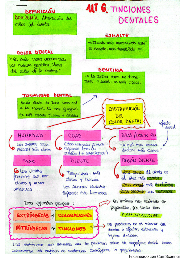 Apuntes coloridos y esquematizados sobre la UT 6: Tinciones dentales. Se encontrará un resumen muy general y visual sobre la unidad con los conceptos más fundamentales.