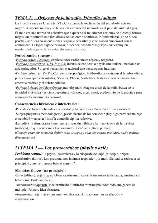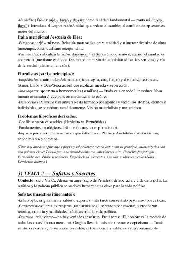 Fª Antigua (Presocráticos, Sofistas, Sócrates, Platón) + parte más esquemática para estudiar