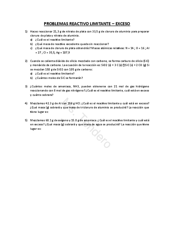 Ejercicios para practicar reactivo limitante-exceso en reacciones químicas.