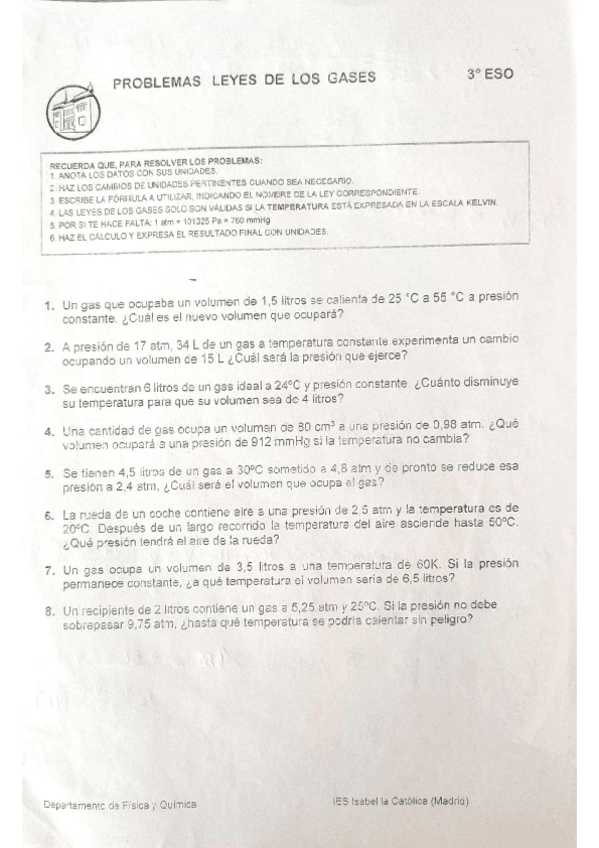 Problemas de las leyes de los gases de física y química de 3°ESO para practicar