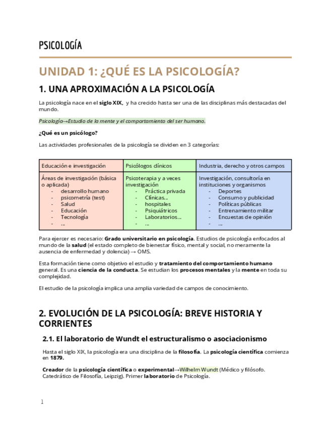 1. APROXIMACIÓN A LA PSICOLOGÍA; 2. EVOLUCIÓN DE LA PSICOLOGÍA: Breve historia y corrientes; 3. ¿ES LA PSICOLOGÍA UNA CIENCIA?; 4. LA PSICOLOGÍA ACTUAL. Ámbitos de aplicación.
