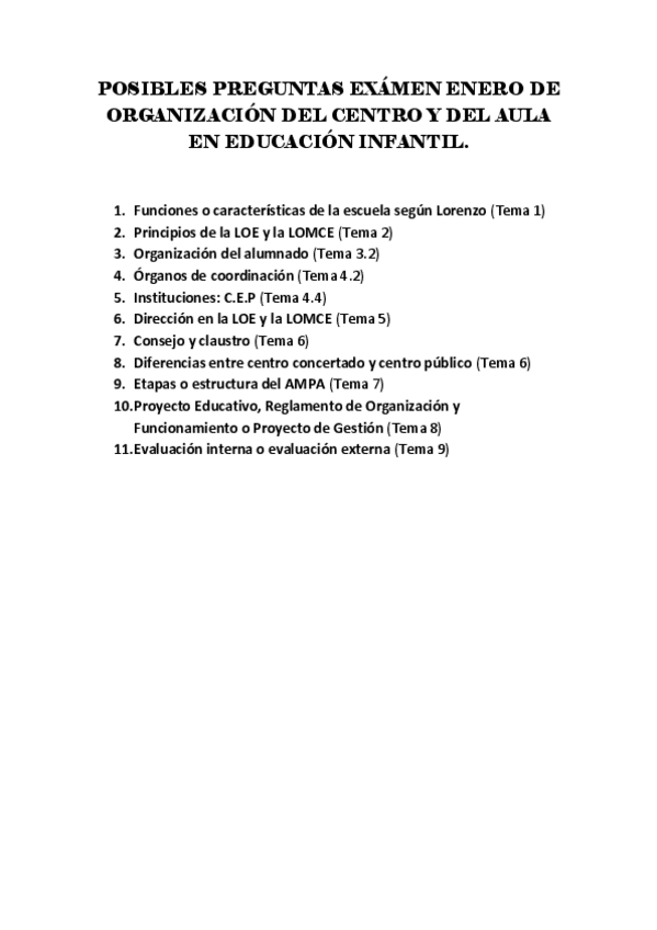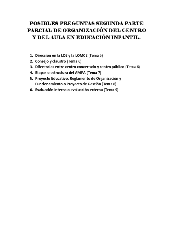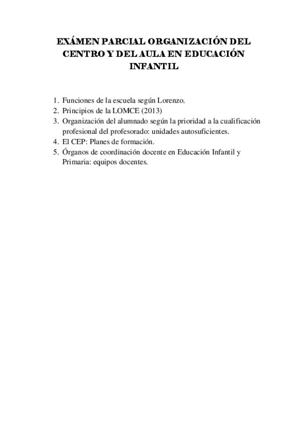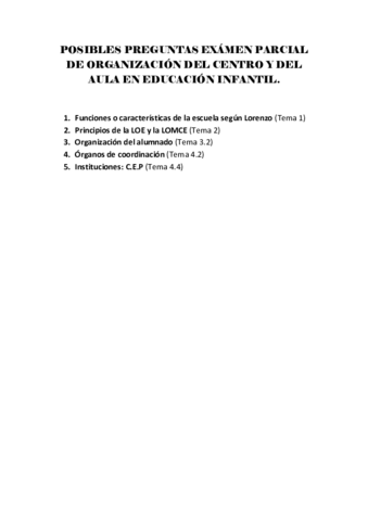 He publicado nuevos examenes de 2º Organización del centro y del aula en Educación Infantil: POSIBLES-PREGUNTAS-SEGUNDA-PARTE-PARCIAL-DE-ORGANIZACION-DEL-CENTRO-Y-DEL-AULA-EN-EDUCACION-INFANTIL.pdf