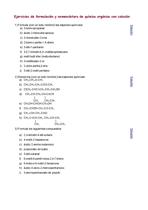 Ejercicios sobre formulación orgánica con soluciones