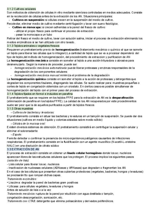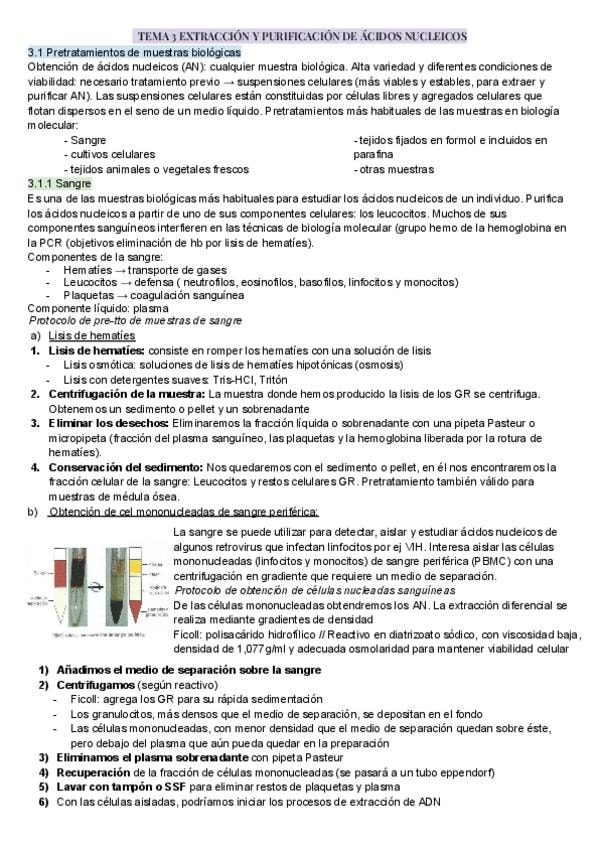Apuntes tema 3: EXTRACCIÓN Y PURIFICACIÓN DE ÁCIDOS NUCLEICOS de biologia molecular y citogenética de laboratorio clínico y biomedico