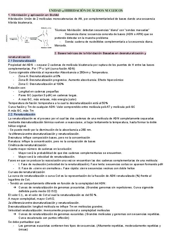 Apuntes tema 4 y 5: HIBRIDACIÓN DE ÁCIDOS NUCLEICOS// TÉCNICAS DE HIBRIDACIÓN de biologia molecular y citogenética de laboratorio clínico y biomedico