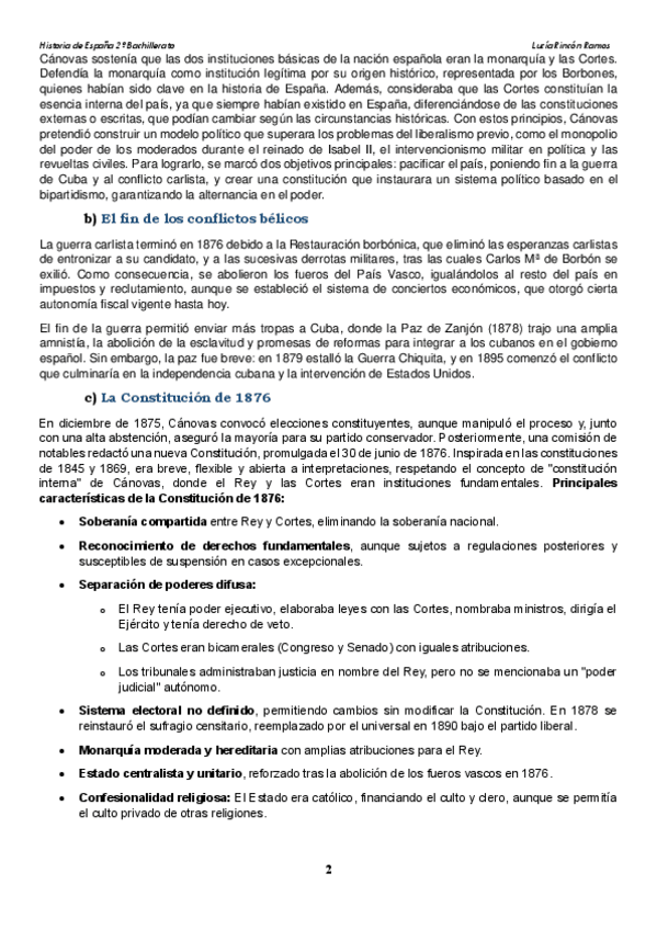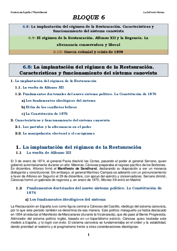 Incluye: La implantación del régimen de la Restauración con las características y funcionamiento del sistema canovista, El régimen de la Restauración con Alfonso XII y la Regencia, y Guerra colonial y crisis de 1898