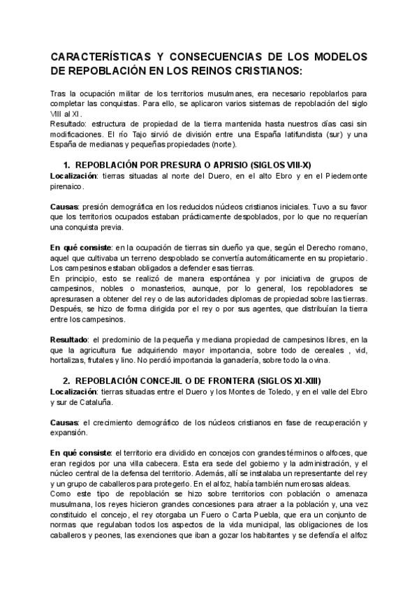 Estándar número 5 de la PAU de Historia de España. Trata el tema de los modelos de repoblación.