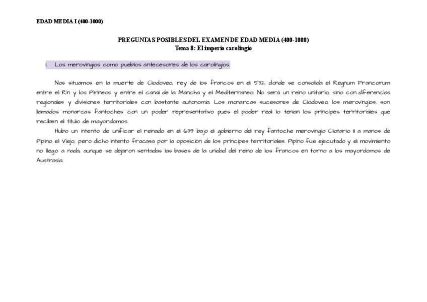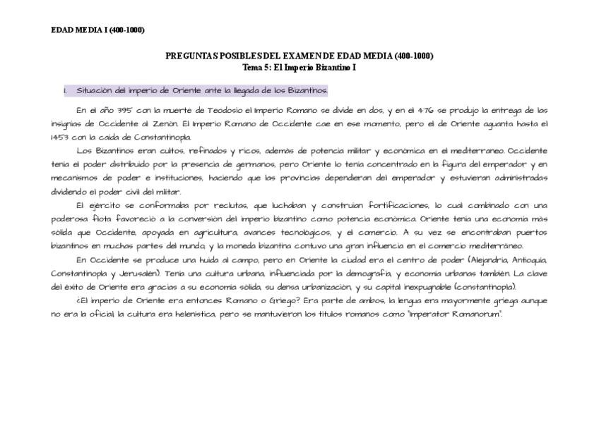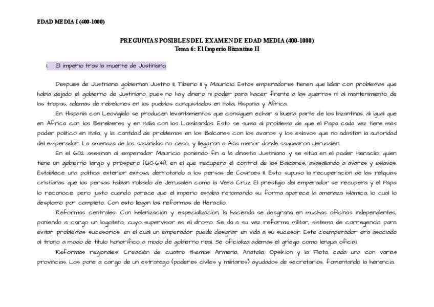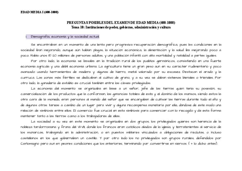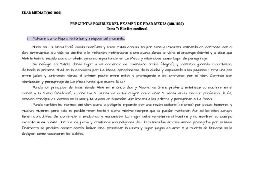 Preguntas posibles por temas de Historia Universal de la Edad Media I