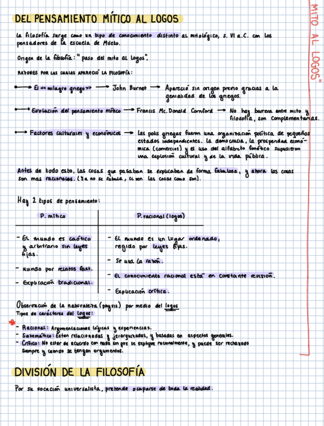 Aproximación al concepto de filosofía, origen del término, el pensamiento prerracional: mito y magia, del pensamiento mítico al logos, división de la filosofía, la filosofía y otras disciplinas, sentido y necesidad de la filosofía, vigencia de la actitud