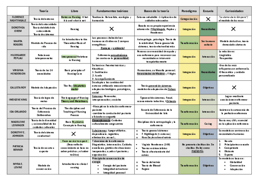 Tabla resumen de las autoras de modelos de la enfermería clasificadas por paradigma y escuela (Virginia Henderson, Florence Nightingale...)