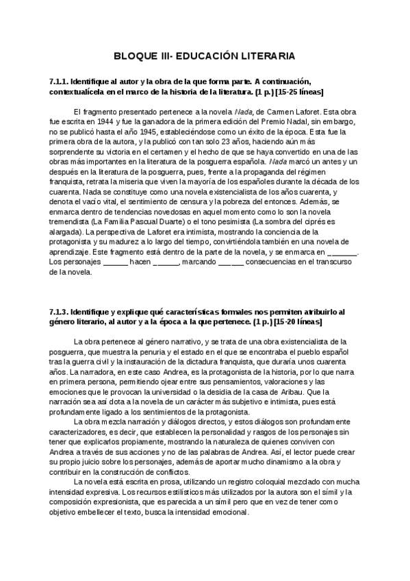 Ejercicios fijos ( I y III ) de la PAU de literatura de Murcia resueltos para Nada de Carmen Laforet