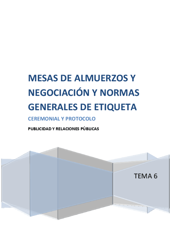 He publicado nuevos apuntes de 4º Ceremonial y Protocolo: 6. LA ORGANIZACIÓN DE MESAS DE ALMUERZOS Y CENAS. REUNIONES Y NEGOCIACIONES..pdf