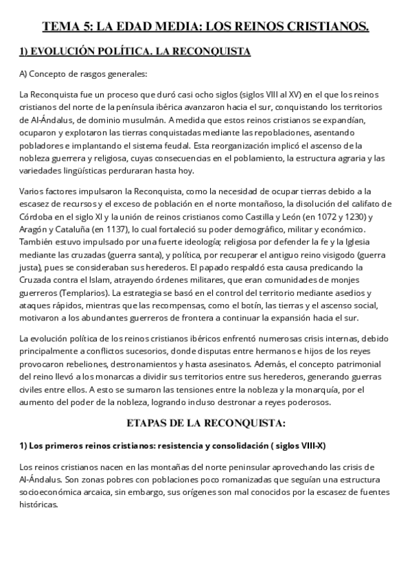 Apuntes T5: Reinos cristianos en la Edad Media (evolución política, repoblaciones, organización político-administrativa, economía, sociedad, escuela de Toledo, Iglesia y crisis)