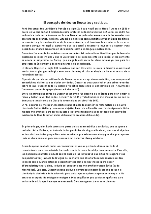 REDACCIÓN COMPLETA SOBRE CONCEPTO DE IDEA DESCARTES 2 BACH FILOSOFÍA