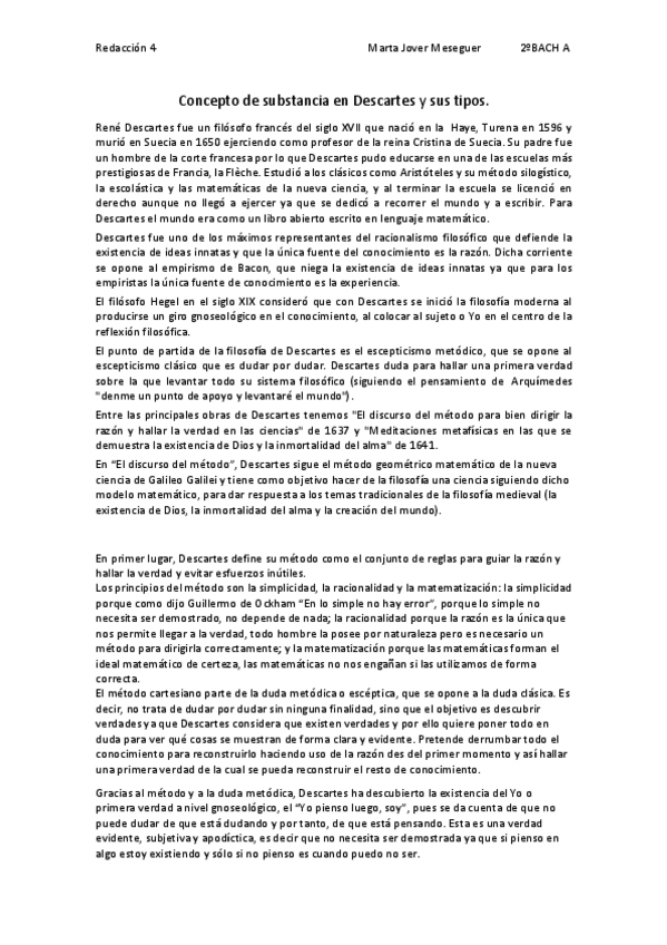 REDACCIÓN COMPLETA SOBRE CONCEPTO DE SUBSTANCIA DESCARTES 2 BACH FILOSOFÍA