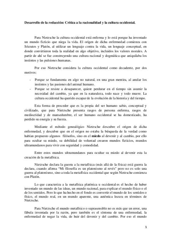 REDACCIÓN COMPLETA SOBRE LA CRÍTICA A LA RACIONALIDAD Y LA CULTURQ OCCIDENTAL DE NIETZSCHE HISTORIA DE LA FILOSOFÍA 2 BACH