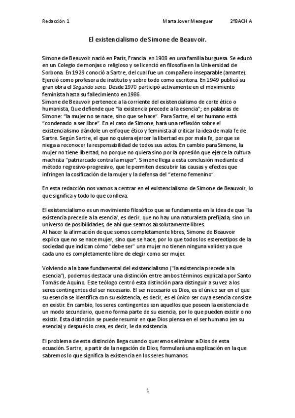 REDACCIÓN COMPLETA SOBRE EL EXISTENCIALISMO DE SIMONE DE BEAUVOIR HISTORIA DE LA FILOSOFÍA 2 BACH