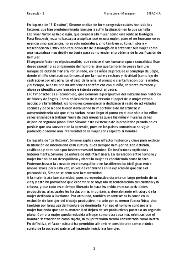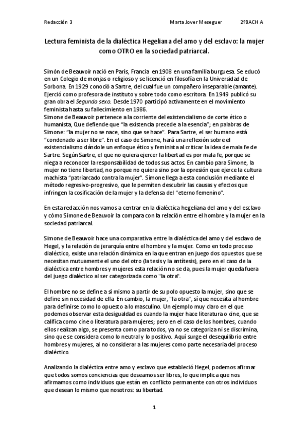 REDACCIÓN COMPLETA SOBRE LA MUJER COMO "OTRO" EN LA SOCIEDAD PATRIARCAL DE SIMONE DE BEAUVOIR HISTORIA DE LA FILOSOFÍA 2 BACH