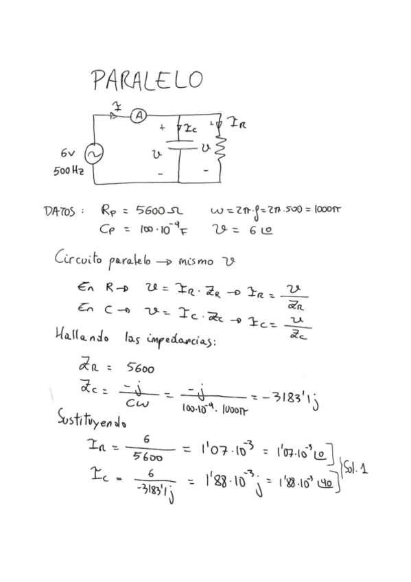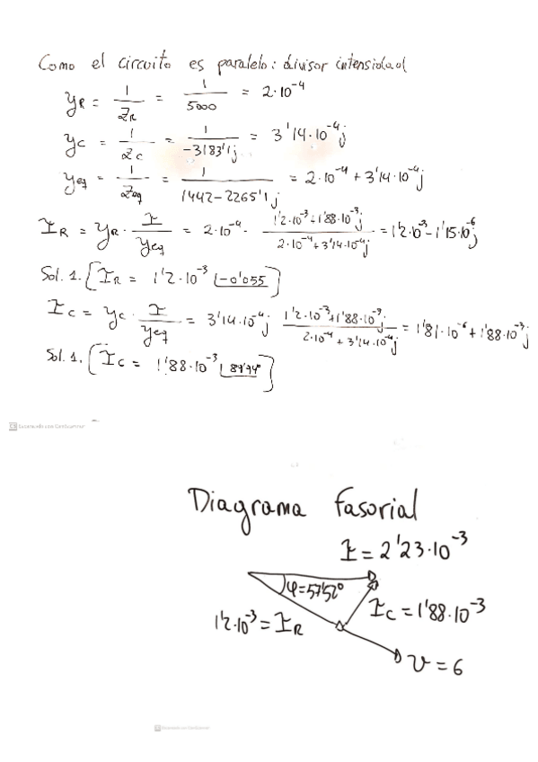 En el circuito paralelo, los fasores de intensidad de R y C tienen ángulos 0º y 90º respectivamente. (Aparece -0.055 y 89.94 que es aproximadamente lo mismo). En el circuito serie, en el diagrama fasorial, dibújalo por arriba (mismos datos)