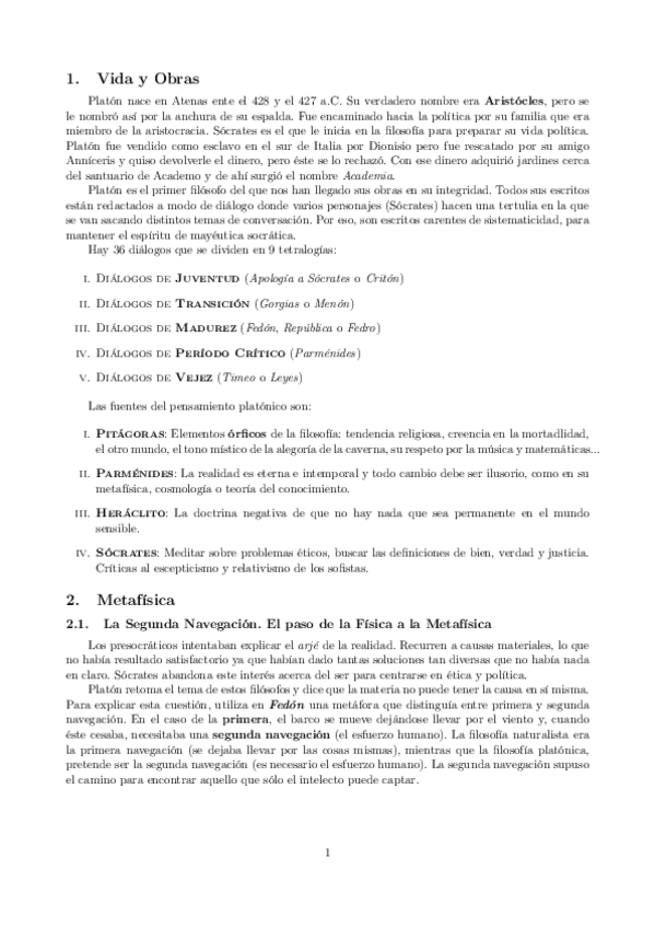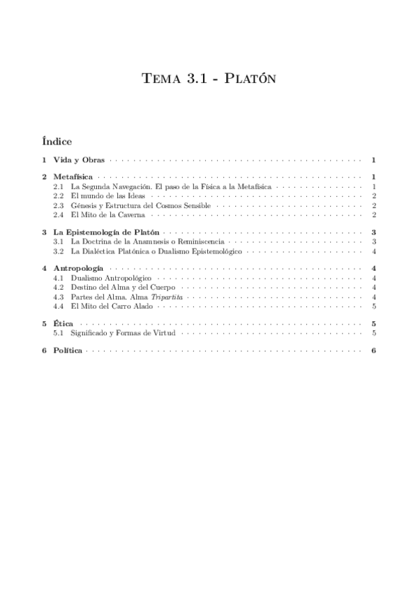 Vida, obras, metafísica, epistemología, antropología, ética y política platónica.