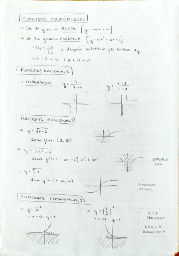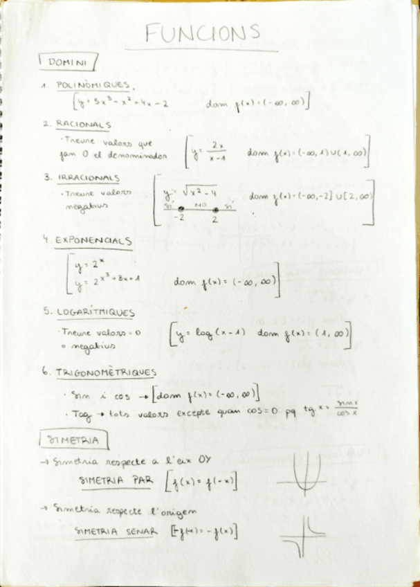 Com trobar el domini, simetria, funcions polinòmiques, racionals, irracionals, exponencials, logarítmiques, operacions amb funcions