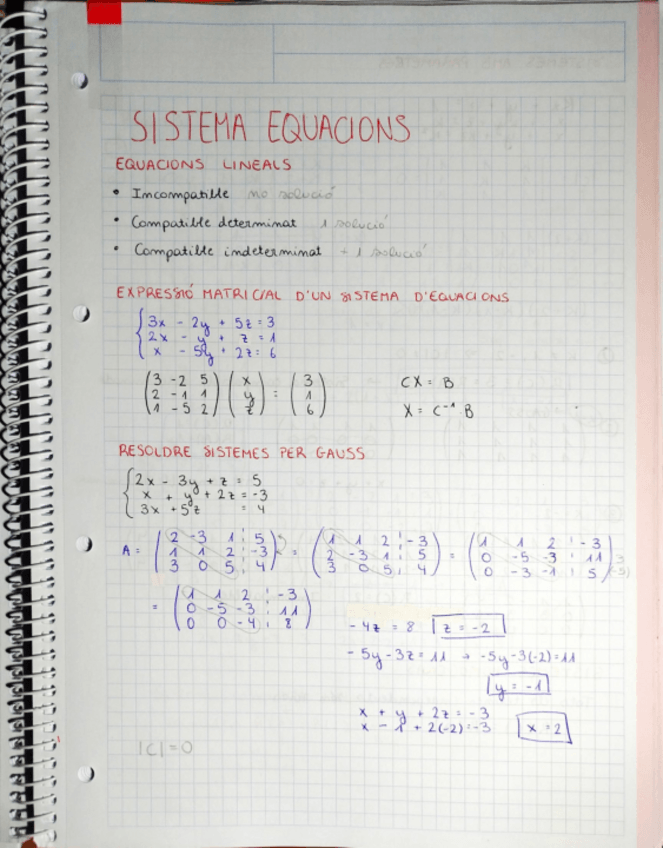 Com resoldre sistemes d'equacions pel mètode de Gauss i la regla de Cramer; i sistemes amb paràmetres
