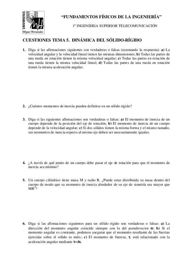 He publicado nuevos ejercicios de 1º FUNDAMENTOS FISICOS DE INGENIERIA I: Cuestiones Tema 6.pdf
