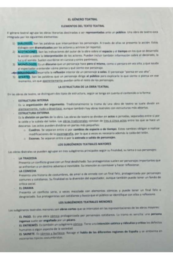 El género teatral, elementos del texto teatral, estructura de la obra teatral, subgéneros teatrales mayores y subgéneros teatrales menores.