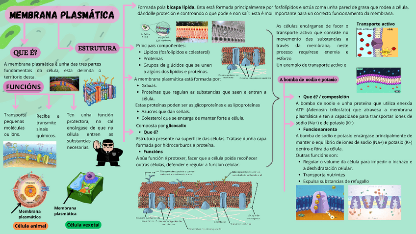 En esta infografía en gallego sobre la membrana plasmática de la célula, aprenderás sus funciones, de que está compuesta y un ejemplo de transporte activo. Además esta viene con dibujos para ayudar la comprensión.