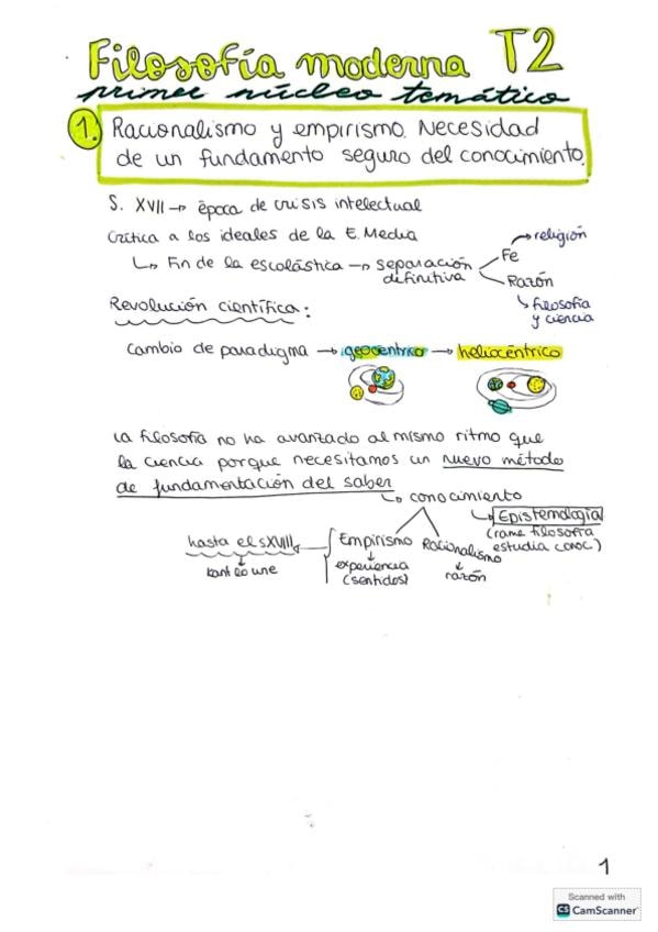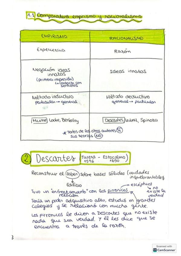 Apuntes esquematizados sobre la Filosofía Moderna con el Racionalismo y Empirismo explicado con los autores Hume y Descartes de la PAU de la Comunidad Valenciana