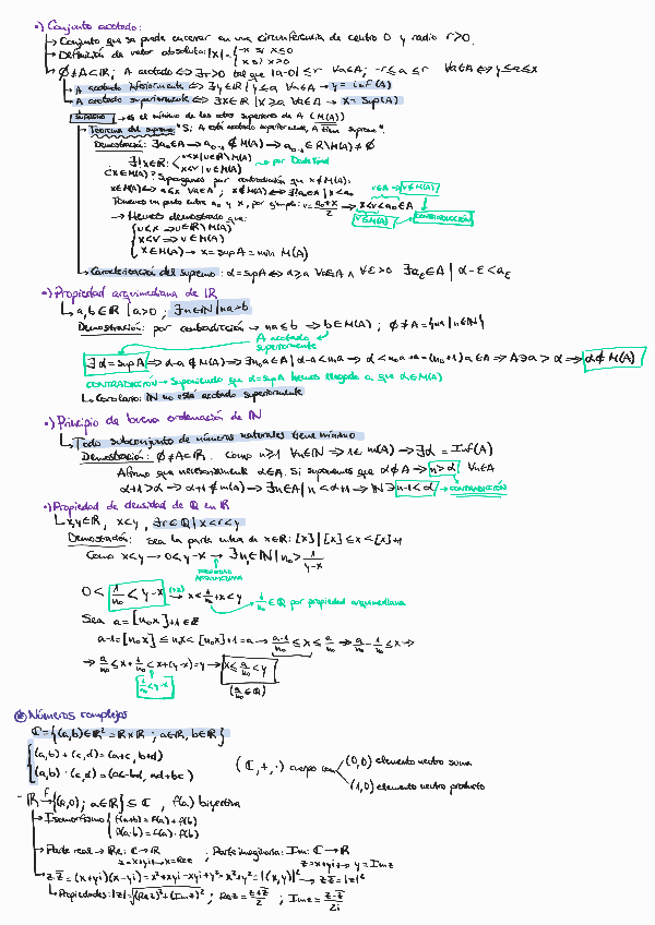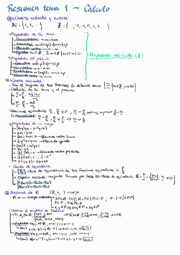 Resumen del primer tema de Cálculo I. Puntos que incluye: - Números naturales y enteros - Números racionales - Axiomas de los números reales - Números complejos - Desigualdades con sus demostraciones (desigualdad triangular, de Cauchy-Schwartz, de Minkows