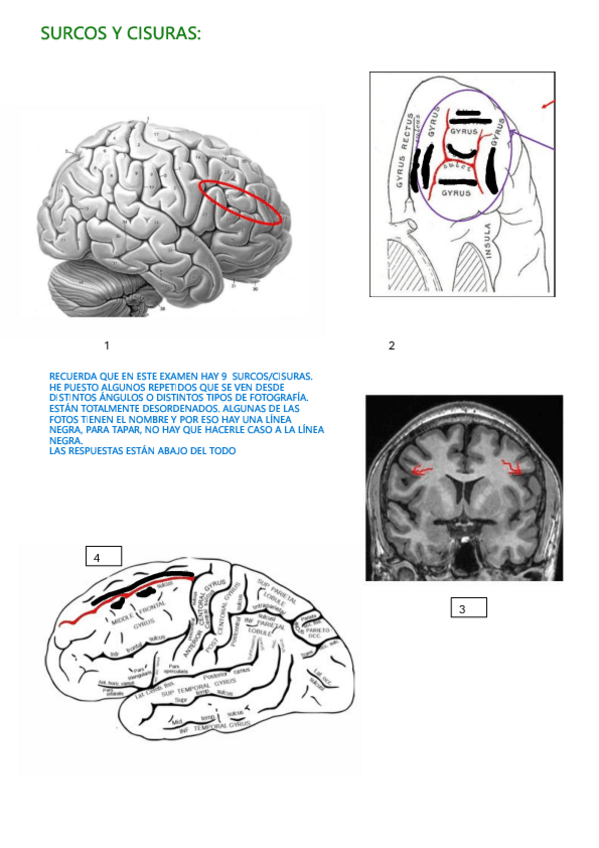 Acabo de publicar un pdf para el primer exámen de laboratorios de funciones con las fotos de los PowerPoints desordenadas para practicar para el exámen. Las respuestas están abajo del todo. Se separa en surcos/cisuras y giros ya que él lo preguntará así en el exámen. Suerte!