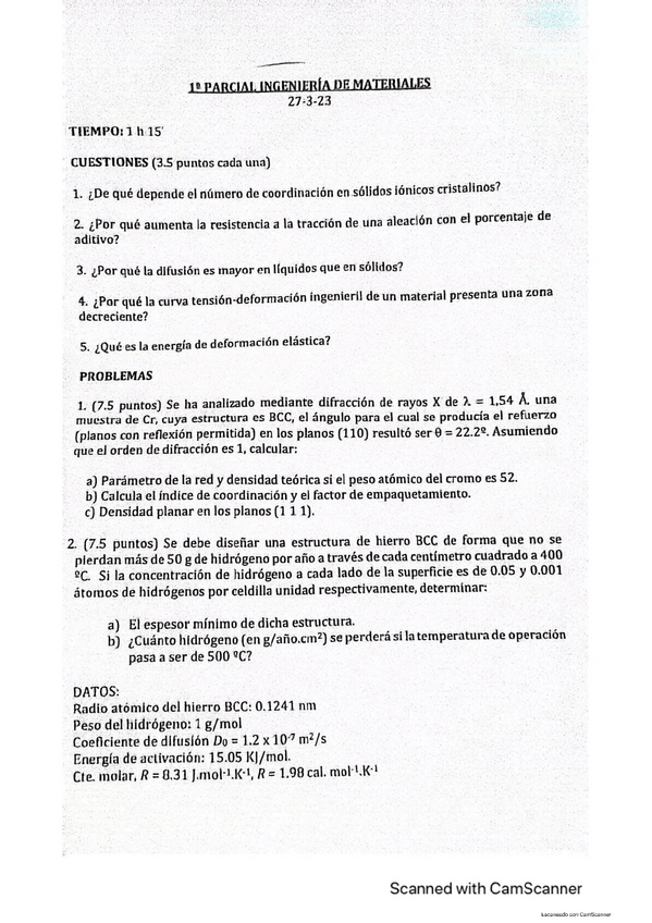 He publicado nuevos examenes de 2º Ingeniería de Materiales: Primer EXAMEN materiales 2023.pdf