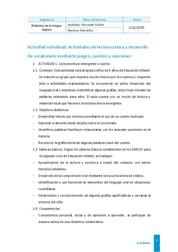 Actividad individual: Actividades de lectoescritura y desarrollo de vocabulario mediante juegos, cuentos y canciones