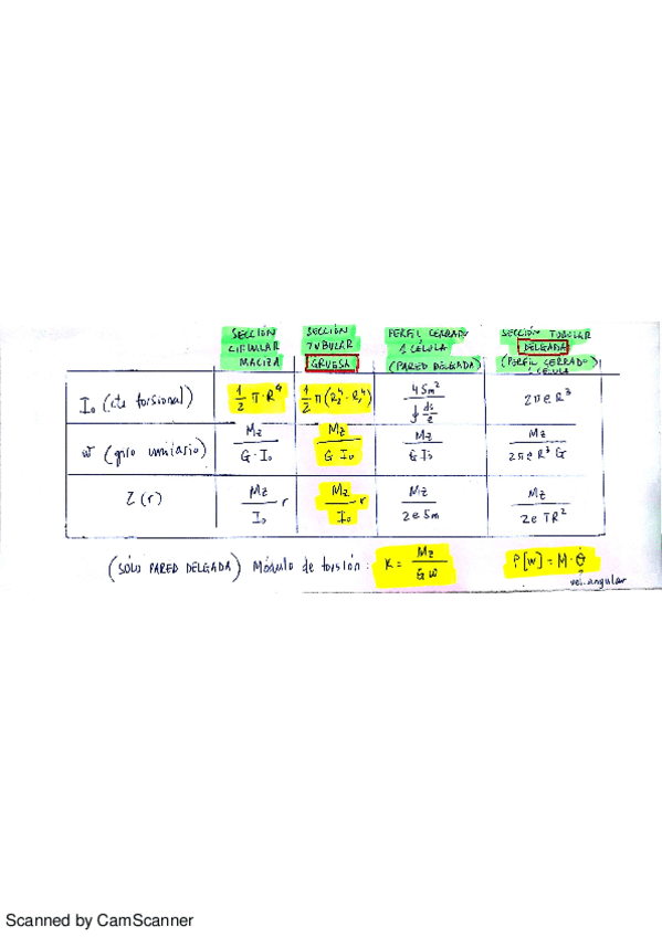 Cuadro completo con todas las fórmulas necesarias para la resolución de problemas de torsión, con todos los casos posibles y anotaciones aclaratorias. Altamente recomendable