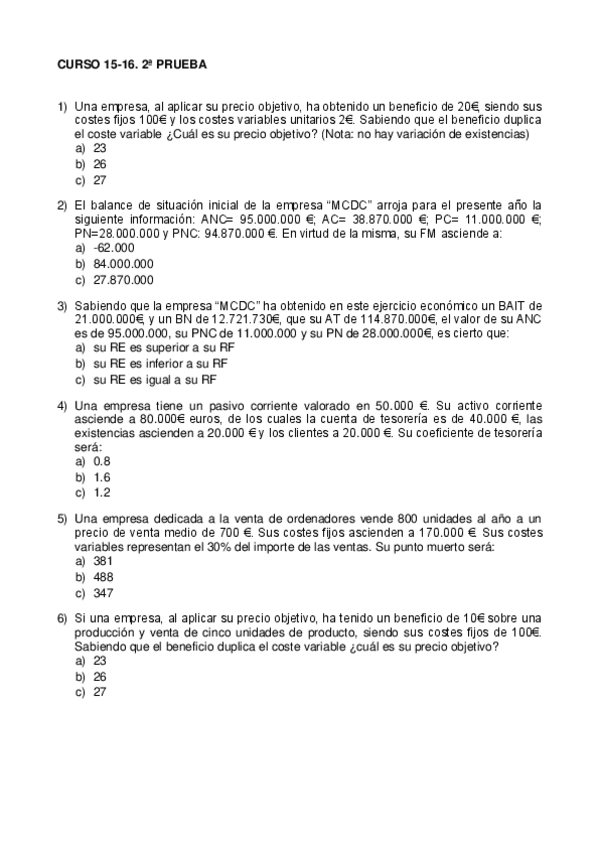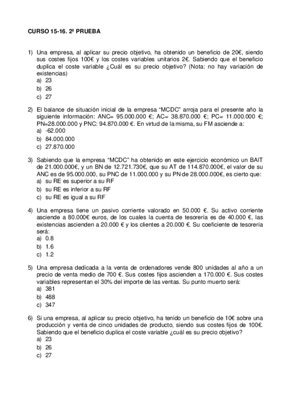 He publicado nuevos examenes de 1º Fundamentos de Economía de la Empresa: examen 15-16 precios soluciones