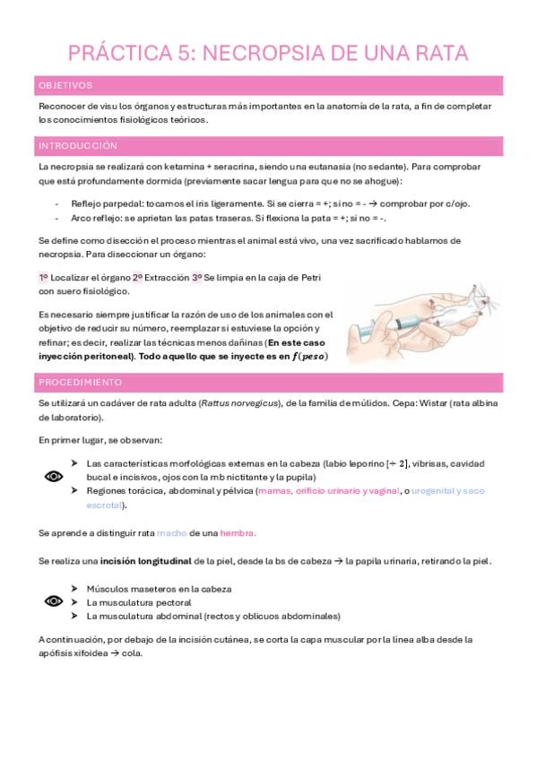 Apuntes de la práctica 5 (Necropsia) de la asignatura de Fisiología animal. Cuenta con esquemas e imágenes.