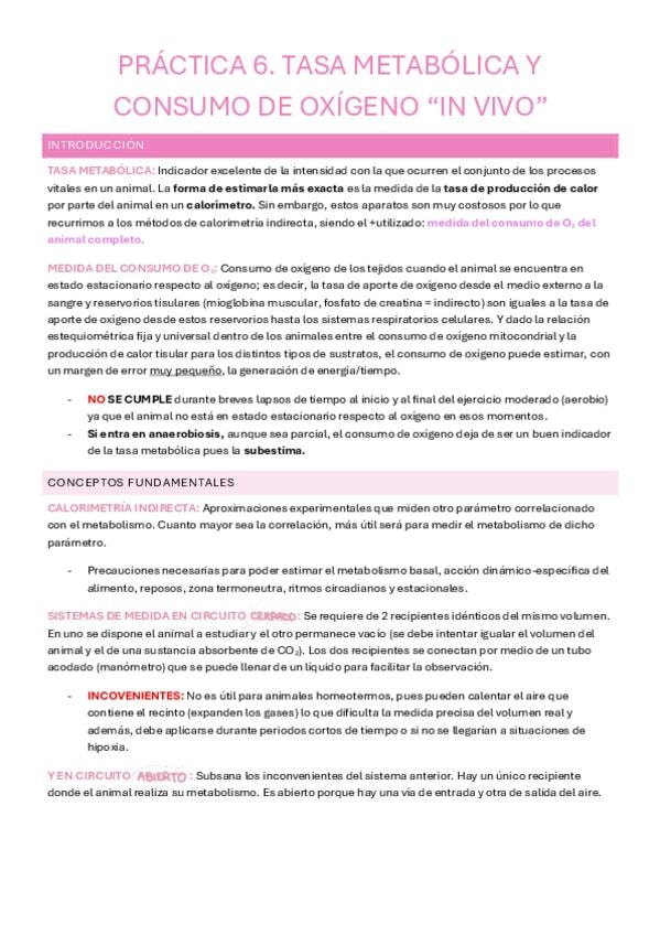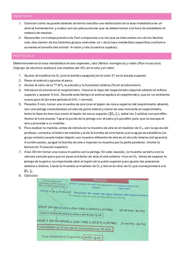 Apuntes de la práctica 6 (Tasa metabólica) de Fisio Animal. Tenéis todo el procedimiento con los cálculos a realizar resumidos en una imagen. Además, se resuelven diferente cuestiones que pueden plantearse de cara al examen.