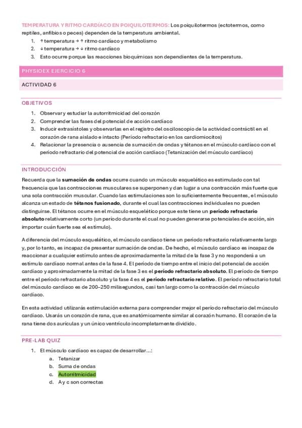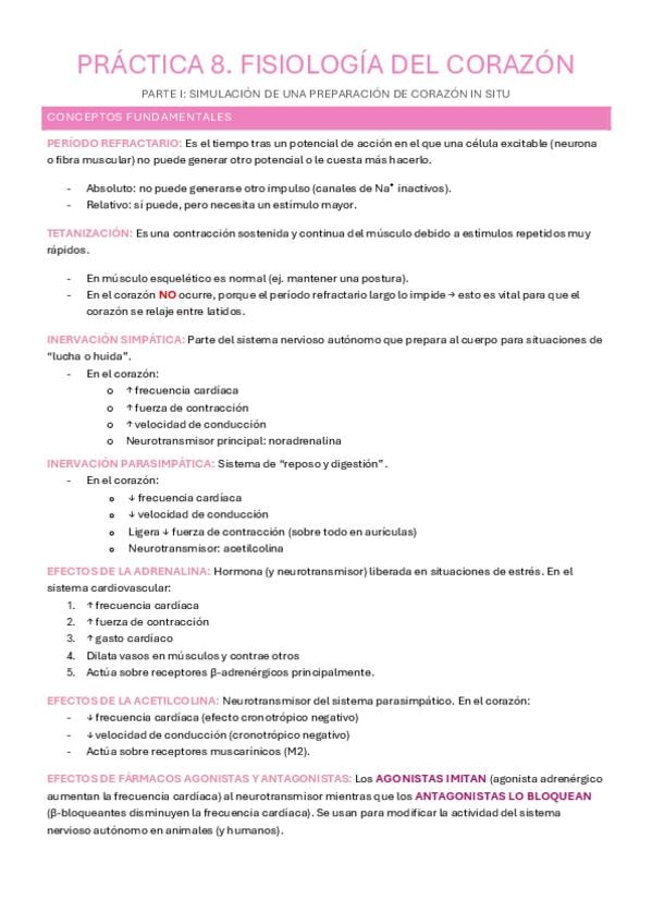 Apuntes de la práctica 8 (Fisio del corazón) de Fisio animal. Están todas las actividades del PhysioEx con el tipo test y resueltas.